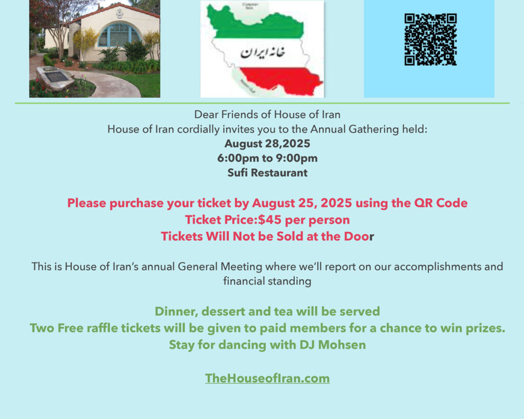 House of Iran is open to the public every Saturday and Sunday from 11:00 a.m. to 4:00 p.m. It hosts special events and general meetings.